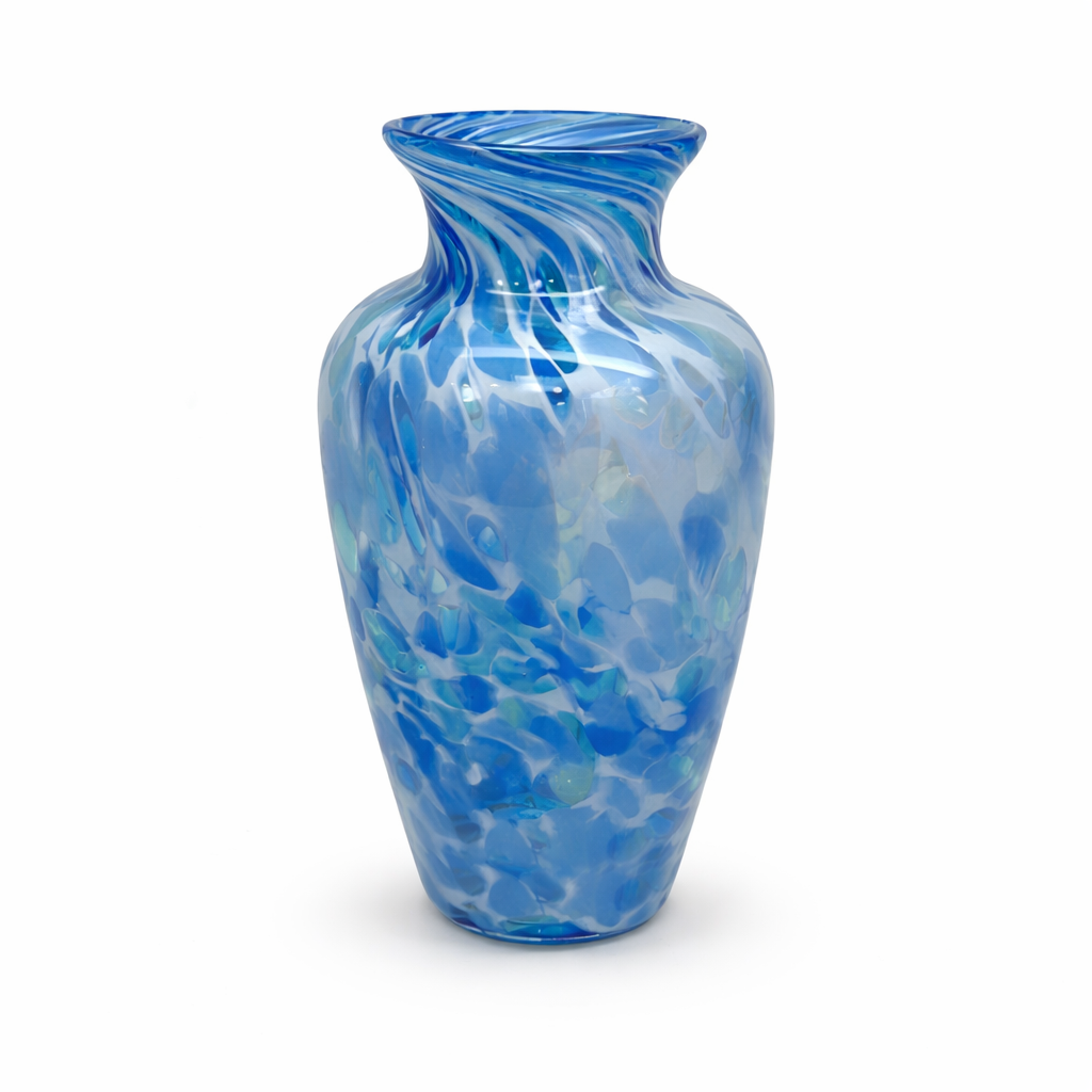 This 5 1/4-inch tall hand blown vase features a cool ocean blue confetti pattern with swirled ribbed detail, making each piece a one-of-a-kind artisan accent for flowers, dried stems, or shelf decor.