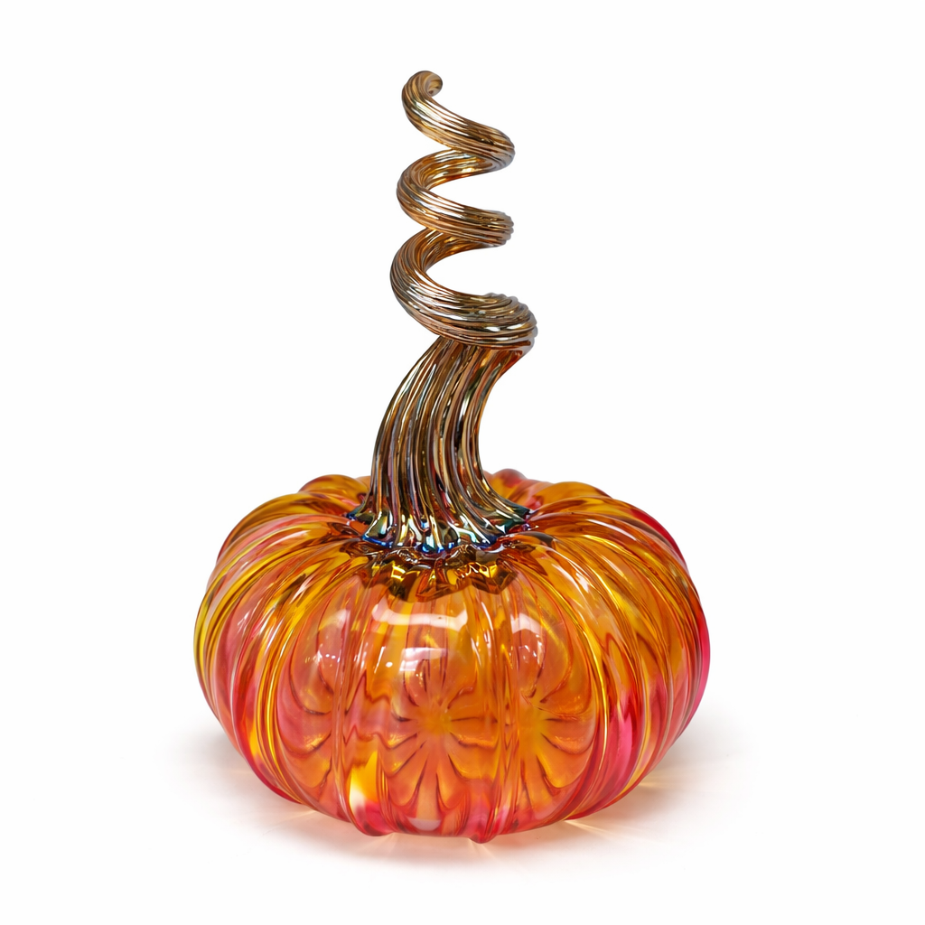Handblown glass pumpkins in vibrant shades of orange, amber, and pink with elegant curled glass stems. Each piece is uniquely crafted, making it a beautiful accent for fall décor, centerpieces, or seasonal displays.