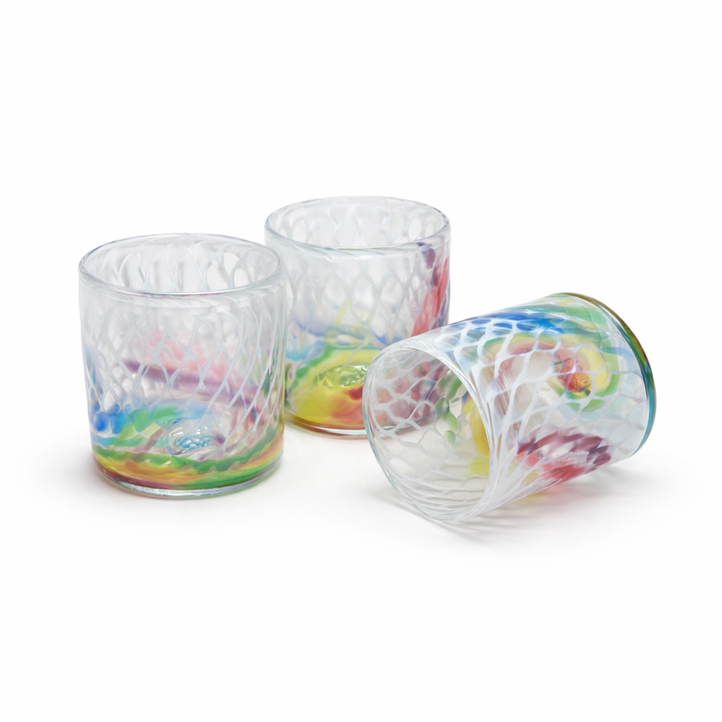 These 3 1/4-inch tall hand blown glasses feature a delicate white lattice pattern with a vibrant rainbow base, making each piece a one-of-a-kind artisan accent for cocktails, wine, or candles.