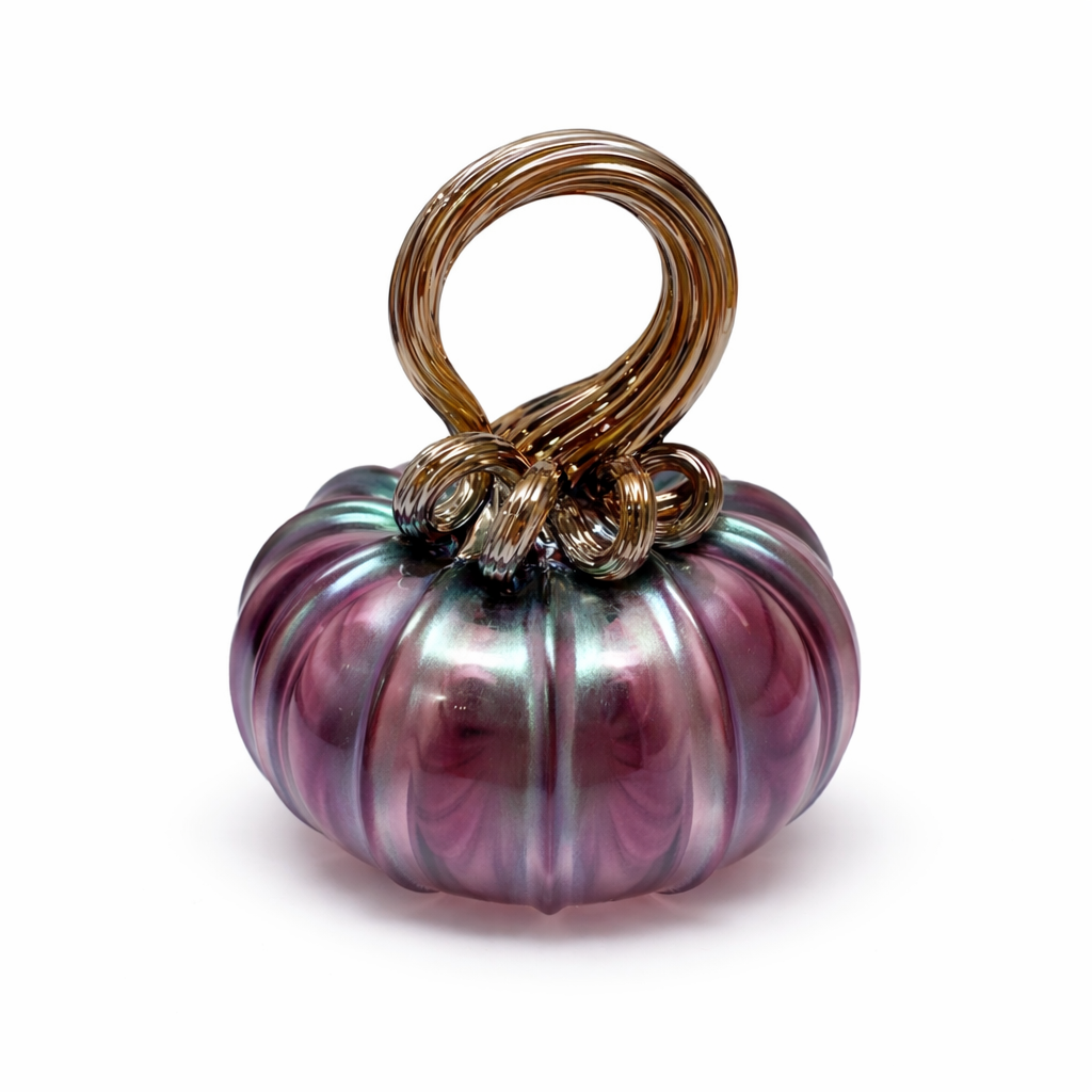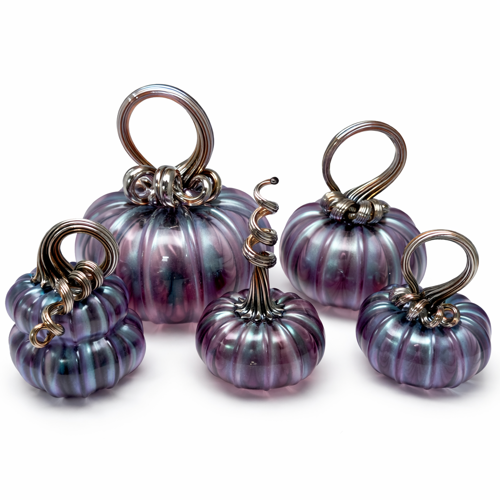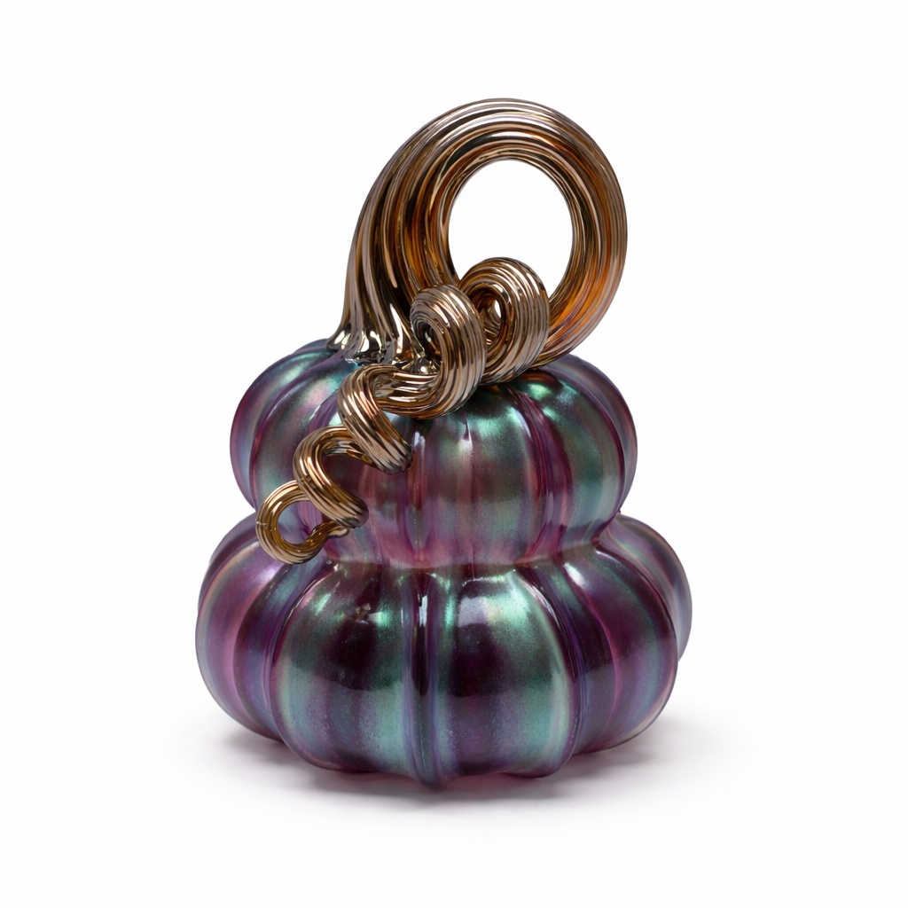 Each pumpkin features luminous swirls of iridescent plum, teal, and soft silver tones that shift beautifully in the light, creating depth and movement from every angle. The sculpted ridges give a classic pumpkin silhouette, while the dramatic, hand-pulled metallic stems loop and curl into elegant, contemporary forms — turning each piece into a true work of art.